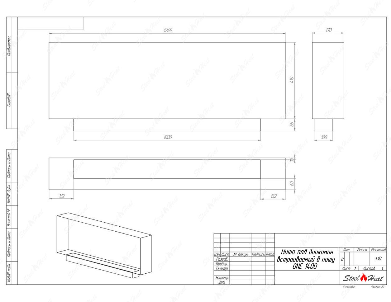 Встраиваемый Биокамин SteelHeat ONE-H 1400 предназначен для встраивания в глухие ниши из гипсокартона, кирпича, пеноблоков, бетона.